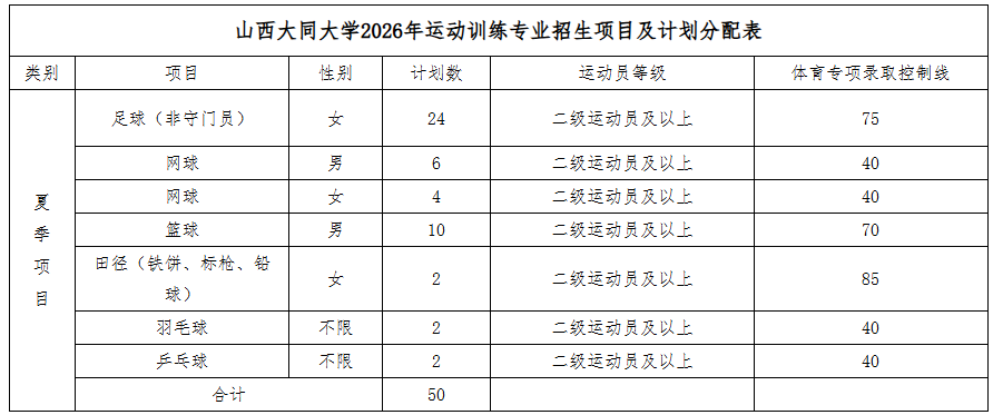 2.体育专项成绩最低录取控制线:足球75分、田径85分、篮球70分、网球40分、羽毛球40分、乒乓球40分。具体见各项目招生计划表。